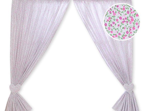 Oryginalne zasłonki wykonane z tkaniny 100% bawełna, atestowanej. Wykończone najwyższej jakości taśmą marszczącą, co pozwala ozdobnie pomarszczyć zasłonki na dowolną szerokość. Taśma jest tak wszyta, aby maskowała żabki i ładnie się układała. Dodatkowe szarfy i serduszka, znajdujące się w komplecie, pozwalają na dowolne śliczne upięcie zasłonek.
