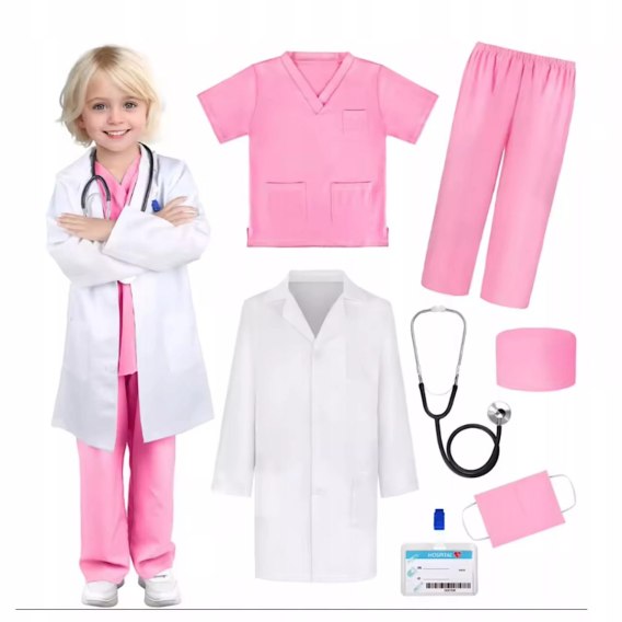 Zestaw kostiumowy pediatry dla dzieci to kompletny strój lekarza przeznaczony dla dzieci w wieku od 3 do 7 lat. W skład zestawu wchodzi: czapka medyczna, kostium lekarski, płaszcz laboratoryjny, lekki jak prawdziwy stetoskop, maska ochronna oraz karta robocza.