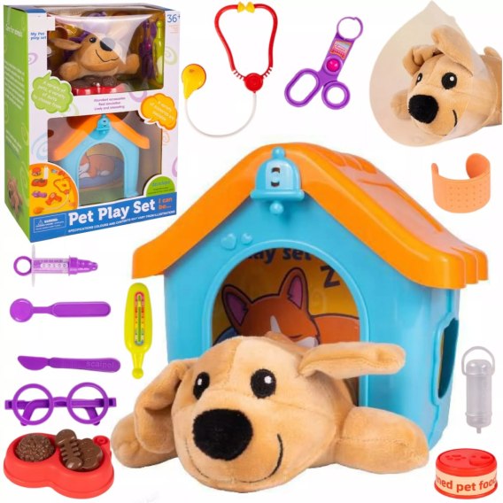 Dziecko może urządzić prawdziwy gabinet weterynaryjny w swoim pokoju, badać pieska stetoskopem, mierzyć temperaturę termometrem i podawać „leki" łyżeczką lub strzykawką. Kołnierz ochronny i opaska-opatrunek uczą, jak dbać o chore zwierzęta i tłumaczą, na czym polega proces leczenia.