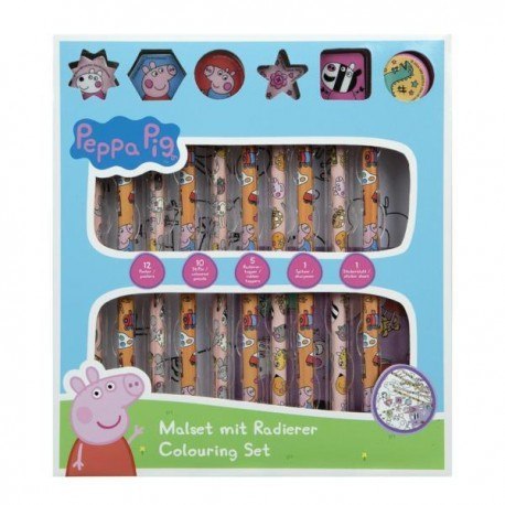 Zestaw do Kolorowania z Naklejkami, 29el. ŚwinkaZestaw do Kolorowania z Naklejkami, 29el. Świnka PeppaZestaw kolorowanek to wymarzony prezent dla każdego malucha. Znajdują się w nim zarówno kredki, kolorowanki z wizerunkami bohaterów ulubionej bajki Świnka Peppa, jak również naklejki ozdobne oraz temperówka i gumki. Tylko wyobraźnia wyznacza tu granice. Nieważne czy jesteś przedszkolakiem, pierwszoklasistą czy piątoklasistą - potrzebujesz przyborów do swojej przygody gdziekolwiek jesteś.Zgrabny zestaw kolorowanek z wizerunkami z bajki Świnka Peppa- 29 el..Idealny do zabawy w domu szkole lub w podróży, zmieści się w każdej torbie, a nawet kieszeni.Wewnątrz: 10 kolorowych kredek, 12 arkuszy do kolorowania, 1 arkusz z ozdobnymi naklejkami, 5 nakładek gumek oraz 1 temperówka.Wykonany ze szczególną dbałością.Wspaniały prezent, funkcjonalny dodatek.Wymiary kolorowanek: 17 cm x 9,5 cm x 0,1 cmWymiary opakowania: 22 cm x 19,5 cm x 2,5 cm.Kategoria wiekowa: dla dzieci powyżej 3 roku życia.Uwaga: produkt przeznaczony dla dzieci powyżej 3 lat. Ryzyko zakrztuszenia.