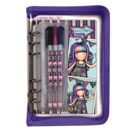 Zestaw Przyborów Szkolnych, Organizer - Gorjuss - Up and Away Fantastyczna seria Up and Away ozdobiona jest grafiką dziewczynki Gorjuss, utrzymana w kolorach głębokiego fioletu. Na odwrocie fajerwerki, kolorowe girlandy, cukrowa wata - wszystko co znajdziemy w wesołym lunaparku. Zestaw przyborów szkolnych zapakowanych w przezroczysty piórnik zapinany na specjalny suwak. Wewnątrz znajduje się kołonotes z 80 kartkami ozdobionymi dekoracyjnym nadrukiem. Na każdej stronie znajduje się miejsce na datę, godzinę oraz notatki dzięki czemu może pełnić funkcję organizera czy dziennika. Ponadto: 3 długopisy - granatowy, różowy i czarny, umieszczone w kieszonce na suwak. Dodatkowo - linijka mogąca pełnić funkcję zakładki. Wymiary: 15 cm x 21,5 cm x 2,5 cm. Zabawna kolekcja Fairground pełna plecaków, akcesoriów i artykułów papierniczych, która nawiązuje do tajemniczych przygód przeżytych w Wesołym Miasteczku. Nie brak tu fajerwerków, karuzel, beczek śmiechu, huśtawek i zdobywanych nagród. Zabawne pompony, słodkie wzory, czy metalowe zawieszki przeniosą nas do barwnego świata Santoro, pełnego niespodzianek. To kolekcja, którą będziemy cenić przez wiele lat. Podążaj za dziewczynami, bohaterkami 4 serii: Up & Away, Fireworks, Carusel i First Prize i odkrywaj ekscytującą kolekcję pełną cudownych smakołyków! 1137GJ04