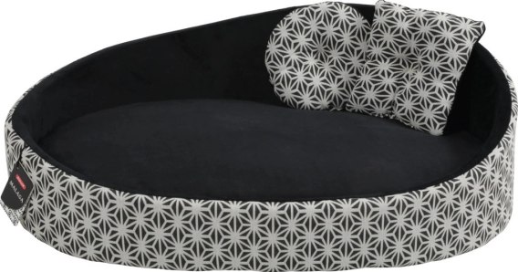 Legowisko dla psa łączące wygodę i doskonałe wzornictwo z grubej tkaniny i futerka, o długości 90cm w kolorze czarnym z białym wzorem.